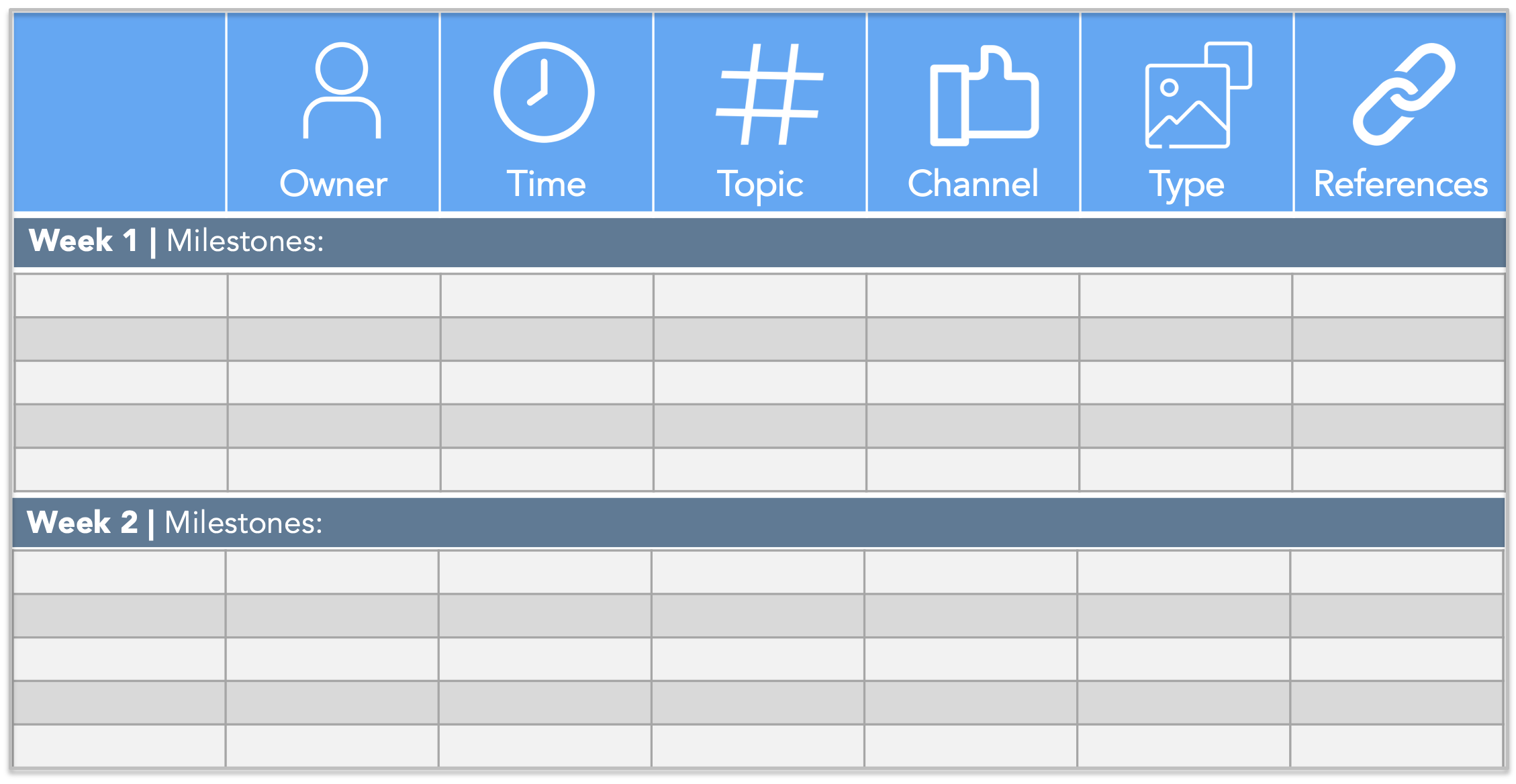 Begin with the vertical column and indicate the specific week along with any milestones that are relevant to your social media activities. These milestones should be a mix of business priorities and cultural moments.