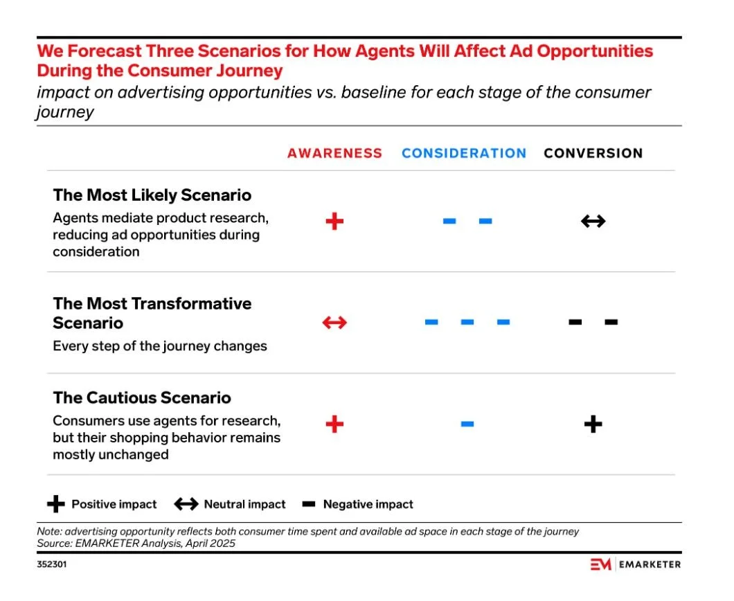 If consumers spend less time searching in this ‘messy middle’ phase, they will spend less time on Google exposed to paid search campaigns. eMarketer projects that AI assistants may lead to 40% fewer ad exposures during this consideration phase, would impact paid search media plans.