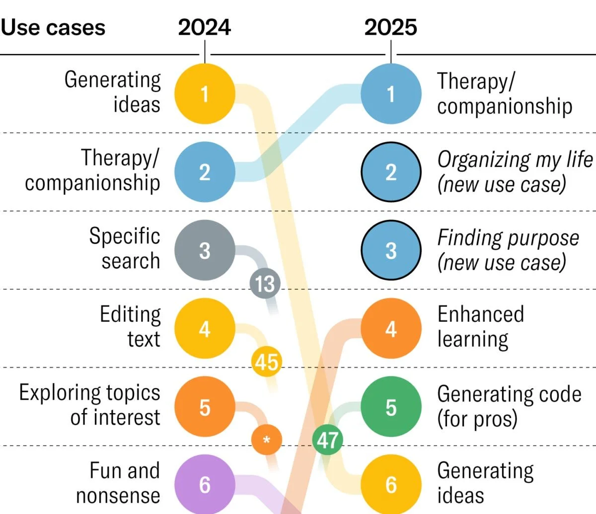 Super interesting shift in how more people are relying on Gen AI for therapy and to help organize their lives. This is consistent with Sam Altman sharing that Gen Z’s “don’t really make life decisions without asking ChatGPT what they should do.”