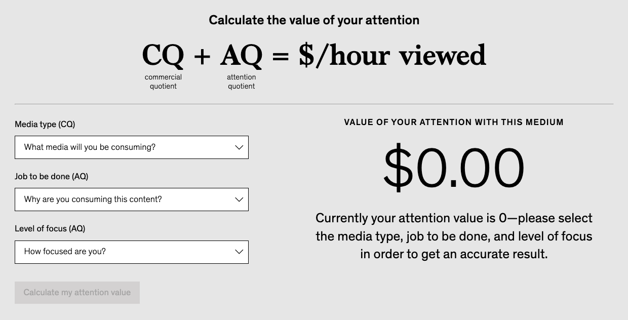 The Attention Equation (McKinsey): If you’re a media planner, review this report before your client asks you about it. It includes an interactive calculator that estimates the value of different interactions and mediums, trying to calculate the quality of the attention vs. quantity.