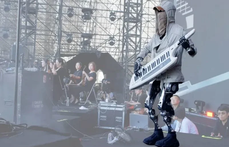 Robot Keytar Player: Ok, music made by AI isn’t cool. But a poorly disguised robot playing keytar on stage at a Chinese Music Festival is.