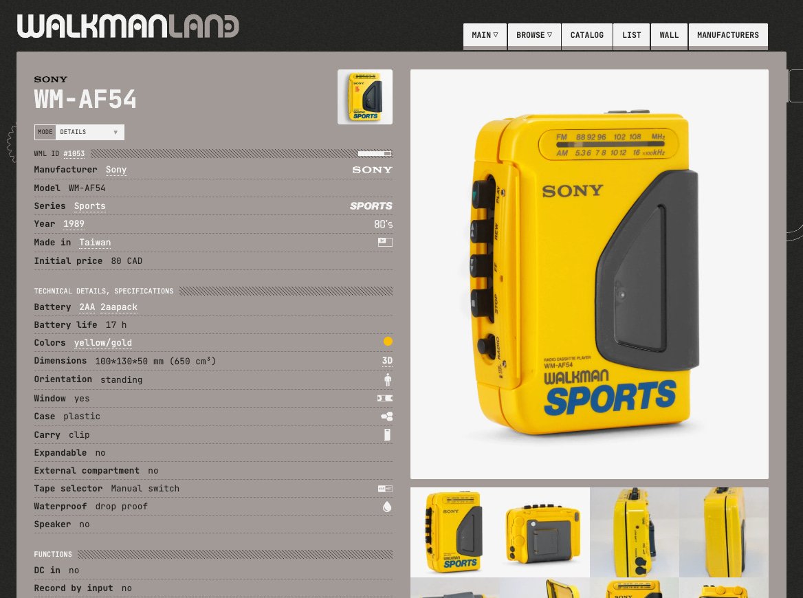WalkmanLand: Careful with this one if you are Gen X, you will go down a rabbit hole. It’s a catalogue archiving Walkmans, including my precious WM-AF54 Sports model.